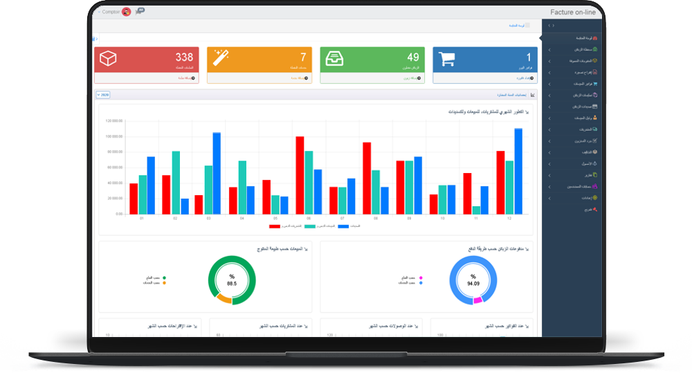Analysez mois par mois l'évolution de votre activité et suivez la variation de votre chiffre d'affaires, paiement clients, achats, etc.