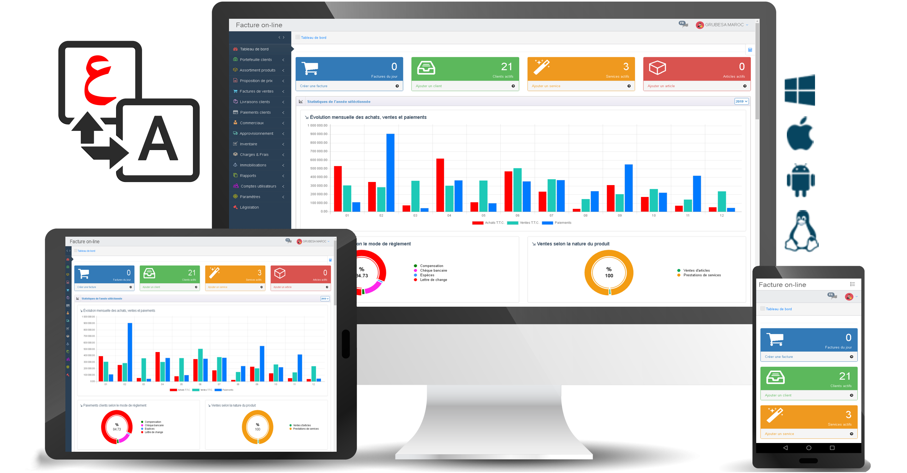 eFacture possède une interface multilingue, simple et ergonomique englobant de nombreuses fonctionnalités qui vous permettront non seulement de mieux suivre votre activité mais également de piloter plus efficacement votre entreprise.